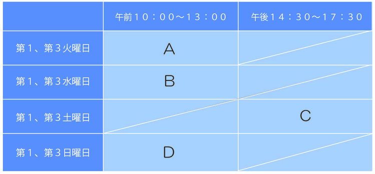 曜日、時間帯は下記表のA~よりお選び下さい。